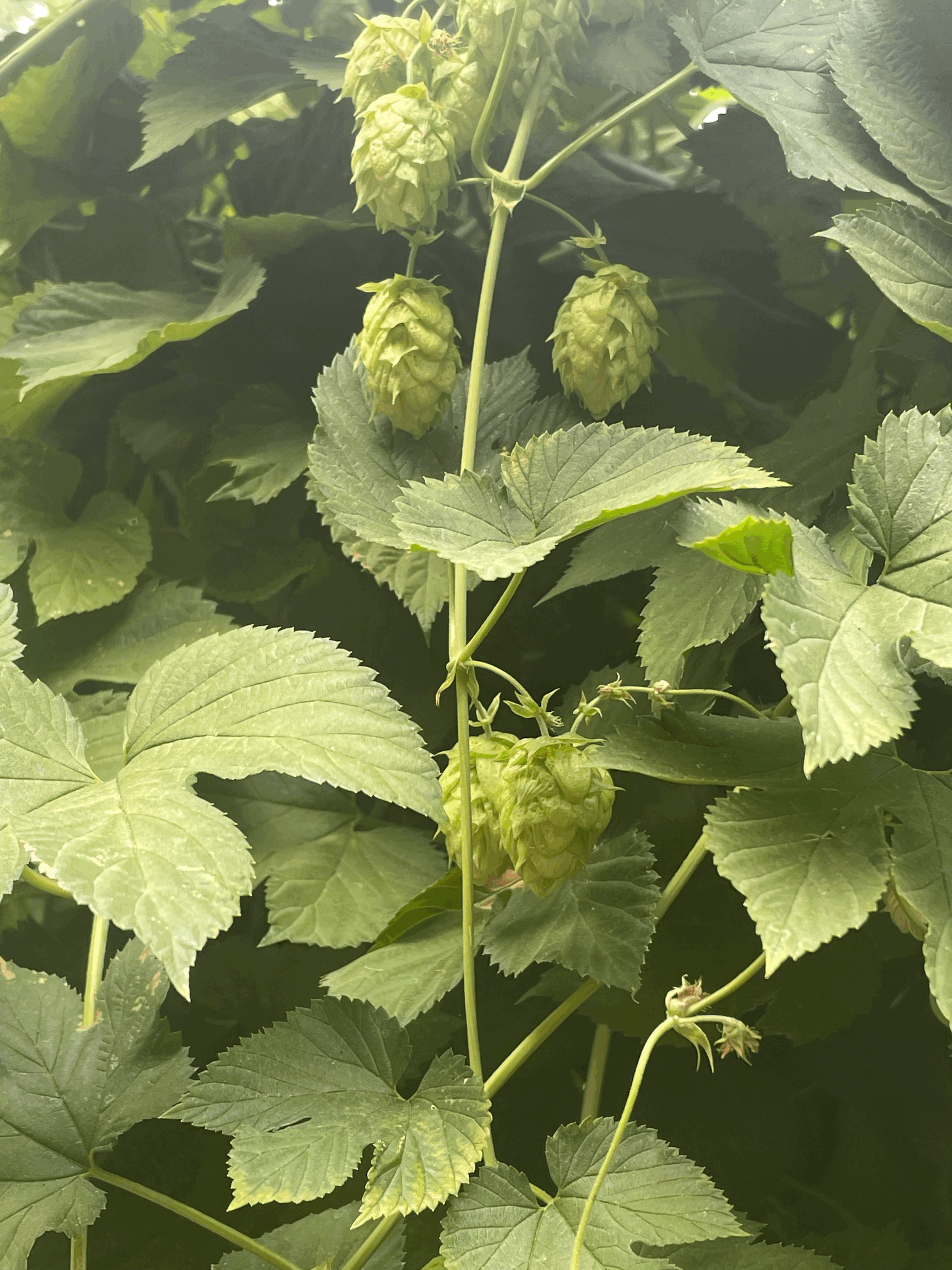 “Hops” is common name for Humulus lupulus, a climbing plant classified as a “bine” (rather than vine) because of its twisting stem and fine hairs that cling to other surfaces as it climbs. The flowers look like small cones and are often referred to as hops cones or strobiles. When the strobiles mature, a gland with yellow powder (lupulin) appears between the green leaves of the cone. This powder, which looks like pollen, contains the hops resins, acids and essential oils of the flower.